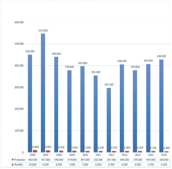 Datos similares os do ano 2008, pero cunha gran diferenza, o numero de traballadores/as. Se no ano 2008 eran necesarios 8.500 homes e mulleres para fabricar 440.000 vehículos, este ano con menos de 5.500 traballadores/as no peor dos casos vanse fabricar 428.000 vehículos.