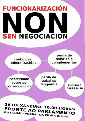 As traballadoras e traballadores laborais da Xunta, en autoconvocatoria, chaman a unha concentración o vindeiro 16, ás 10 h, diante do Parlamento,, contra as novas medidas que Feijoo quere meter a través dumha Lei de Acompañamiento, nos Orzamentos deste ano.